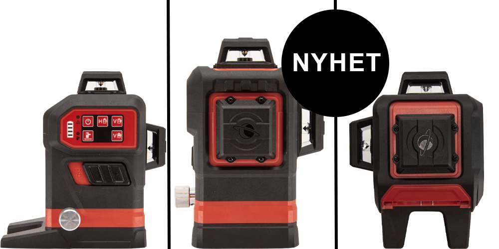 leveres med en interaktiv fjernkontroll. Andre horisontal linje under enheten, 20 mm over gulvet - Nøyaktighet 1 mm / 10 m - Rekkevidde 2x 60 m - Li-Ion-batteri.