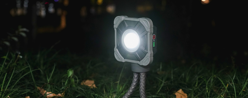 Justerbar lysstyrke i to moduser. Gummibelagt håndtak. Metallstøtte som kan vinkles til 60˚ når den er i bruk. Kan også henges på vegg eller monteres på stativ. 3 m tilkoblingskabel og 2 stikkontakter med selvlukkende lokk. Støvog vannbeskyttelse i henhold til IP54. 3 m kabel IP 54. Med 2 strømuttak og USB.