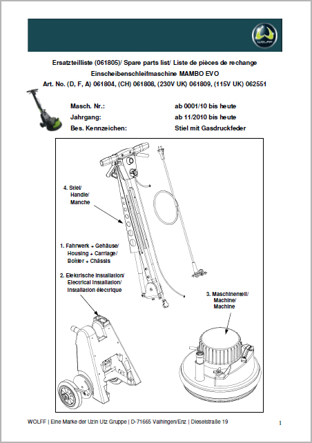 Her finner du PDF med oversikt over deletegninger for Wolff Mambo Evo slipemaskin: