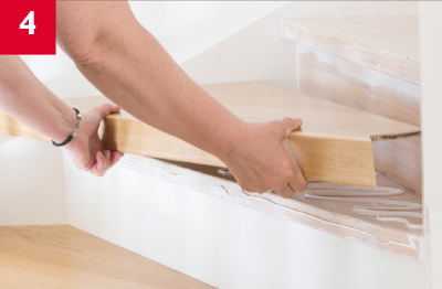 | Monter det nye trappetrinnet Legg det tilkappede fornyelsestrinnet på plass, og tramp på trinnet for å fordele limet så jevnt som mulig mellom materialene. Kontroller at trappefornyelsestrinnet ligger akkurat der det skal før limet herder. |
