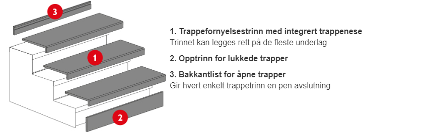 Det som danner grunnlaget for konseptet for trappefornyelse er trinnene med integrert trappenese. De fremstilles av nøye utvalgte materialer, og takket være forskjellige sorteringer, finnes det muligheter for valg og variasjon. Stusstrinn og bakkantlister i matchende stil sørger sammen med annet montasjetilbehør for en solid totalløsning når du skal fornye trappen din.
