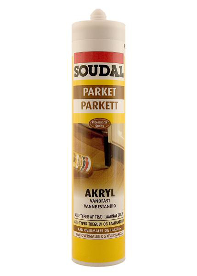 Soudal Parkettkitt 300 ml, Lys eik/bøk, for fylling av sprekker på tregulv, panel, laminat etc 1-komponent plastelastisk fugemasse for oppfylling av sprekker og fuger på tregulv, veggpanel, parkett, laminat mm. Kan slipes, lakkes og oljes over. Patroner à 310 ml.