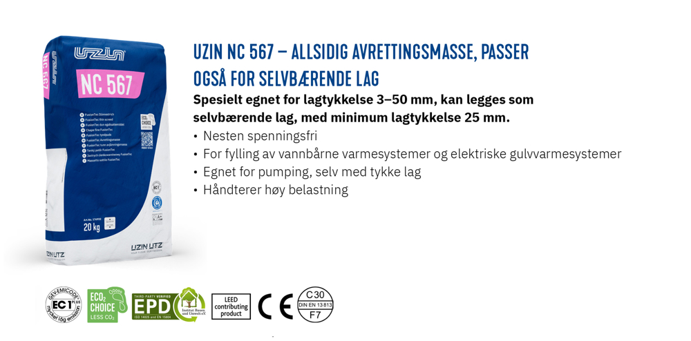 SVÆRT GOD MILJØYTELSE VED GULVLEGGING• Dramatisk reduksjon av CO₂ med gjennomsnittlig 25 % sammenlignet med sementbaserte avrettingsmasser; i enkelte tilfeller opp til 39 %